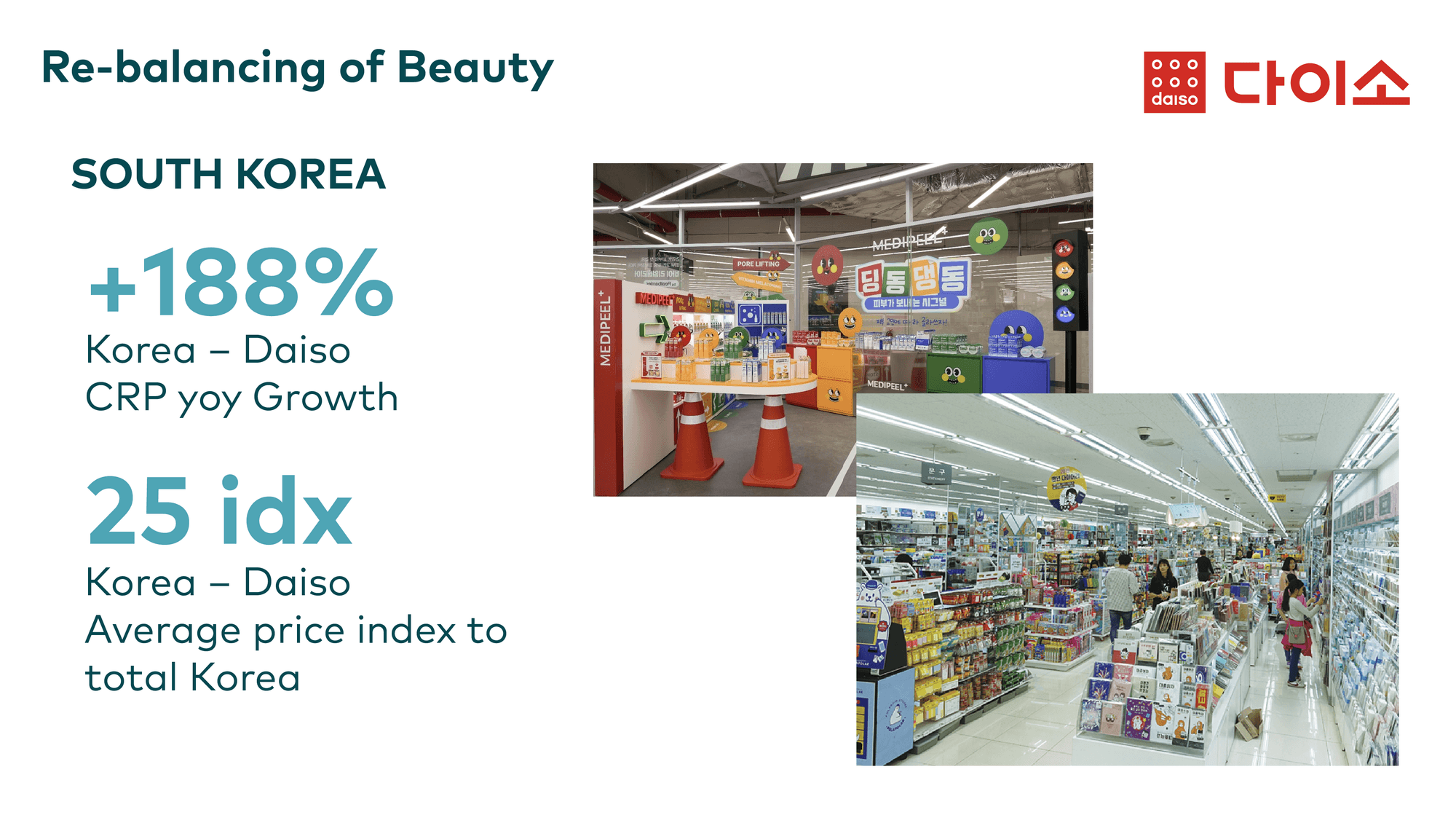 In South Korea – where beauty penetration is already over 98% – discount chains that offer surprising deals are thriving. South Korean consumers seek both diversity and value-for-money from Daiso, which sells products at around a quarter of the total market average. This opens doors for people to experiment and try out new products to build their regime because the risk is so low.