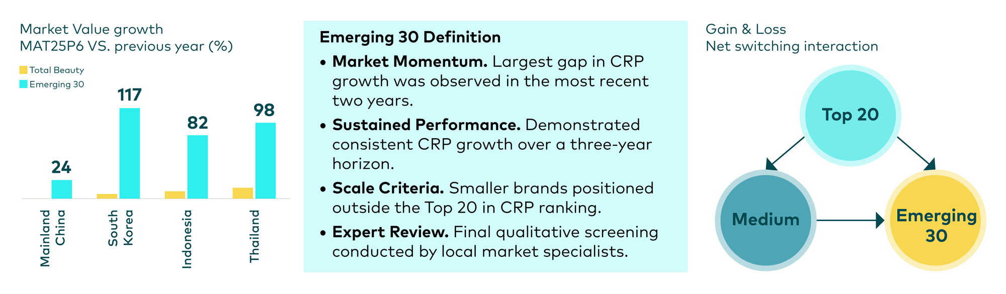 The emerging beauty brands have achieved remarkable value growth over the last year, with spend up 117% in South Korea, 98% in Thailand and 82% in Indonesia. These brands aren’t just growing fast – they’re moving money away from larger brands, and winning over switchers.