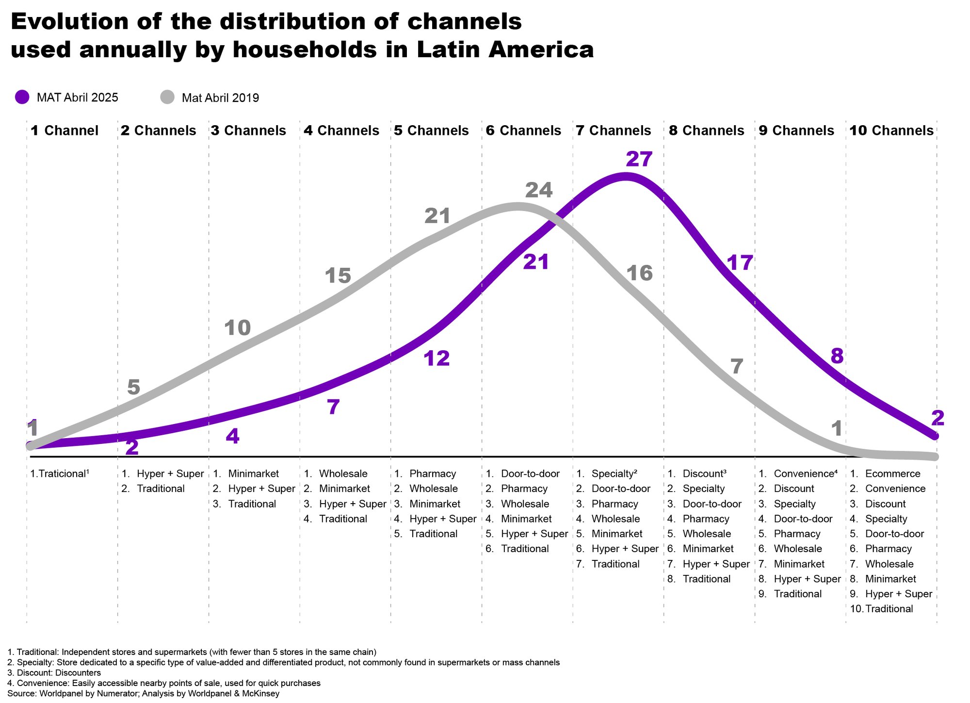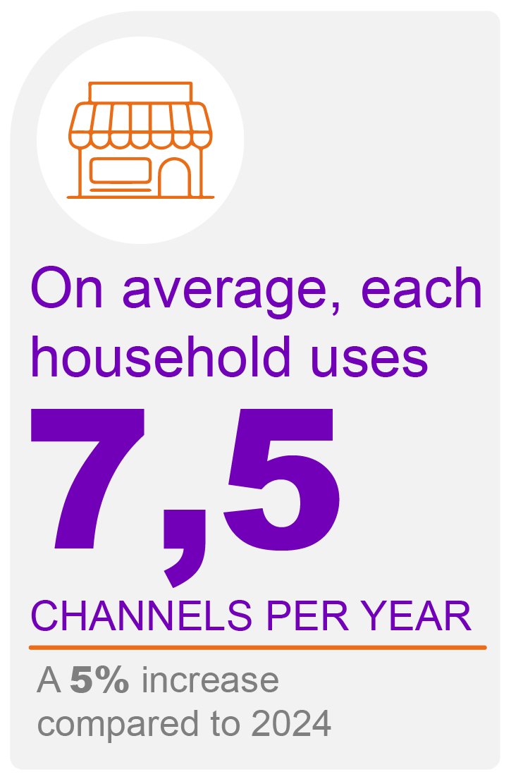Latin American consumers are broadening their range of choices. By April 2025, 52% of households shopped regularly in seven or more channels, exploring different formats to optimize both time and budget. On average, each household uses 7.5 channels per year — a 5% increase compared to 2024 — with countries such as Ecuador (+1.3 channel), Bolivia (+0.8) and Chile (+0.7) standing out.