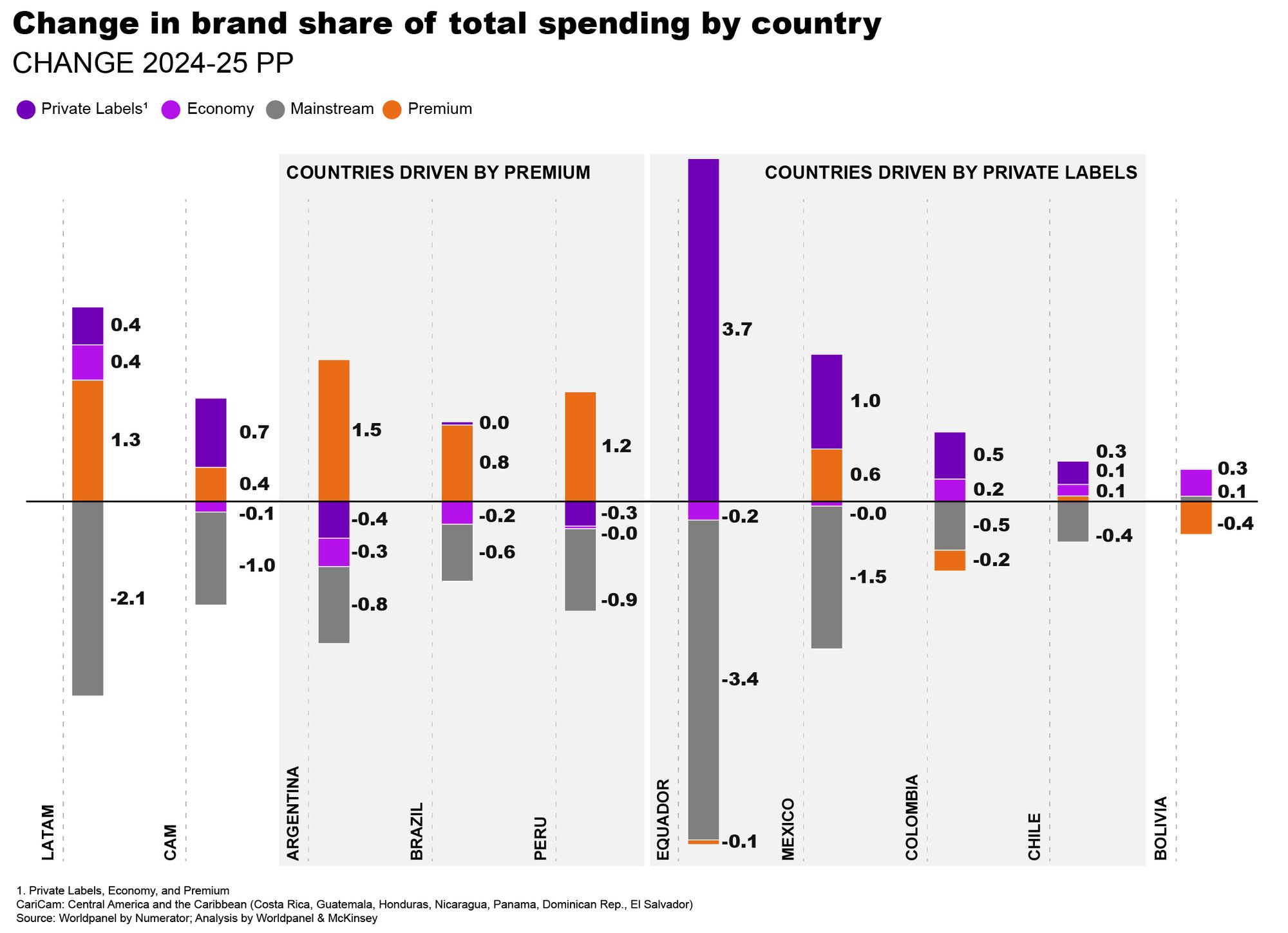 It is also worth highlighting that the advance of both premium and private-label brands extends across different categories — from dairy to household cleaning products — though with distinct dynamics in each country. Argentina, Peru, and Brazil are driving the rise of premium, with these brands gaining 2%, 1.3% and 1% in value share, respectively. In turn, Ecuador, Mexico, and Colombia see private labels as their main growth engine, boosted by the expansion of discount stores in these markets.