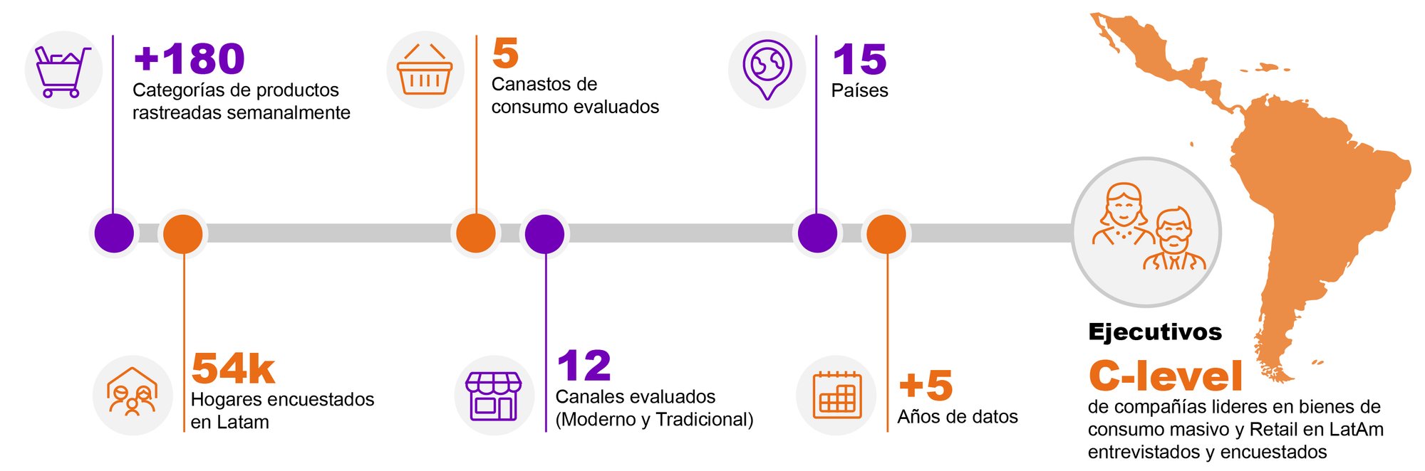 El análisis se construyó con datos recopilados hasta abril de 2025, basados en los hábitos de más de 50.000 hogares en 15 mercados latinoamericanos, que abarcan cientos de categorías de productos organizadas en seis grandes canastas de consumo. En total, se evaluaron 12 canales de compra —tanto modernos como tradicionales—, proporcionando una visión precisa de dónde, cómo y por qué ocurren las decisiones.
