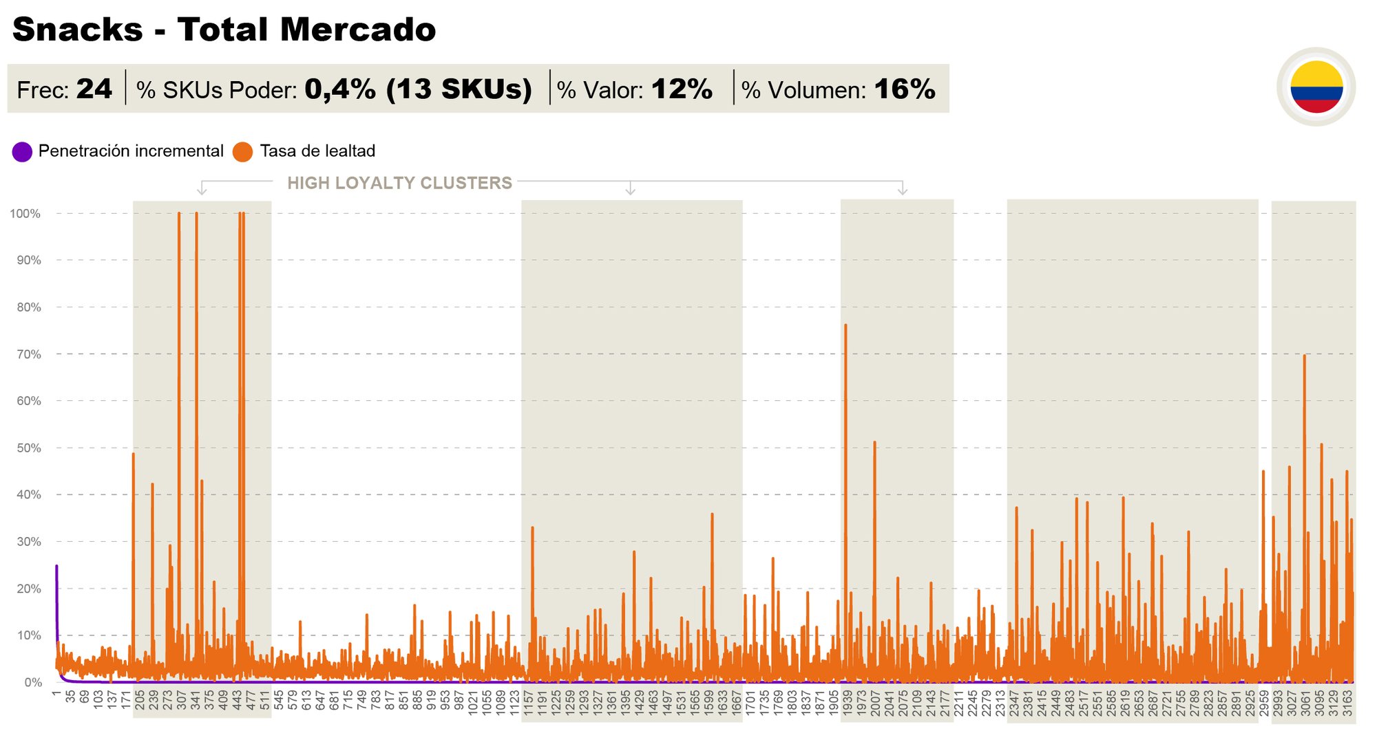 En Colombia, en la categoría de snacks, por ejemplo, se observan SKUs con alta lealtad a lo largo de la curva, lo que evidencia una fuerte conexión con grupos específicos de consumidores. Al inicio de la curva, estos SKUs adquieren aún mayor relevancia, ya que su ausencia en el canal puede representar una pérdida significativa de shoppers para la marca.