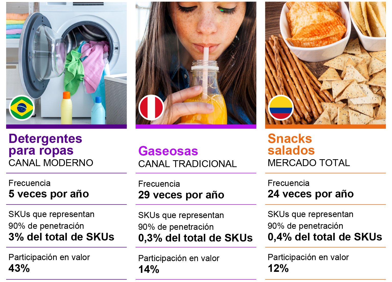 Tomemos como ejemplo Brasil, en el canal moderno – categoría de detergentes: es una categoría de baja frecuencia que depende de un mayor número de SKUs (3 %) para construir penetración de canal y acumular valor. Esto significa que el surtido de productos clave está más fragmentado, dando a las marcas una mayor oportunidad de asegurar su espacio con los tamaños de empaque adecuados, incluso con menos ocasiones de compra.