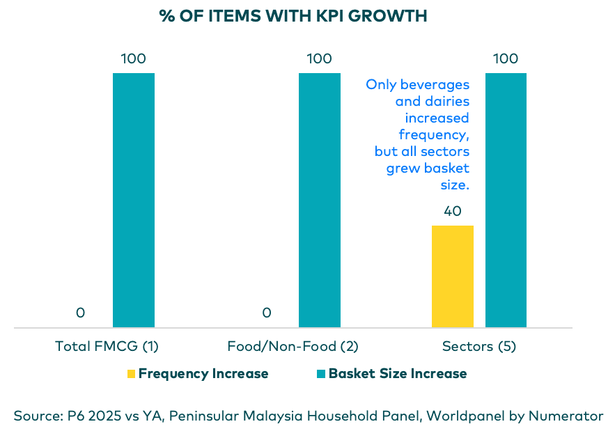 This applies to the two major sectors within FMCG: Food and Non-Food. Neither sector grew in frequency, but both grew in terms of basket size. This shows how uniform the trend for fewer FMCG trips is in Malaysia.