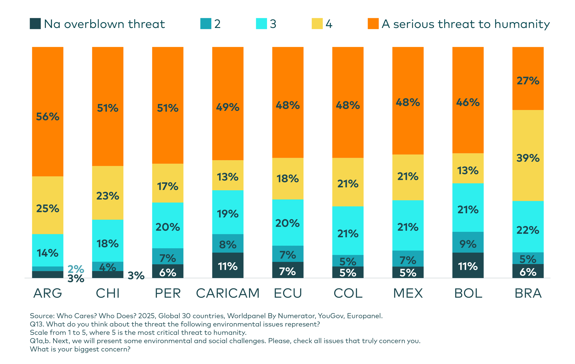 These structural differences also shape how people perceive the environmental crisis. Although the social and economic debate has grown stronger in recent years, 47% of the population still see climate change as a major threat to humanity — well above the global average of 33%. Brazil, along with some Central American countries, deviates slightly from this pattern: only 27% consider the issue extremely serious — partly a reflection of the country’s environmental privileges.