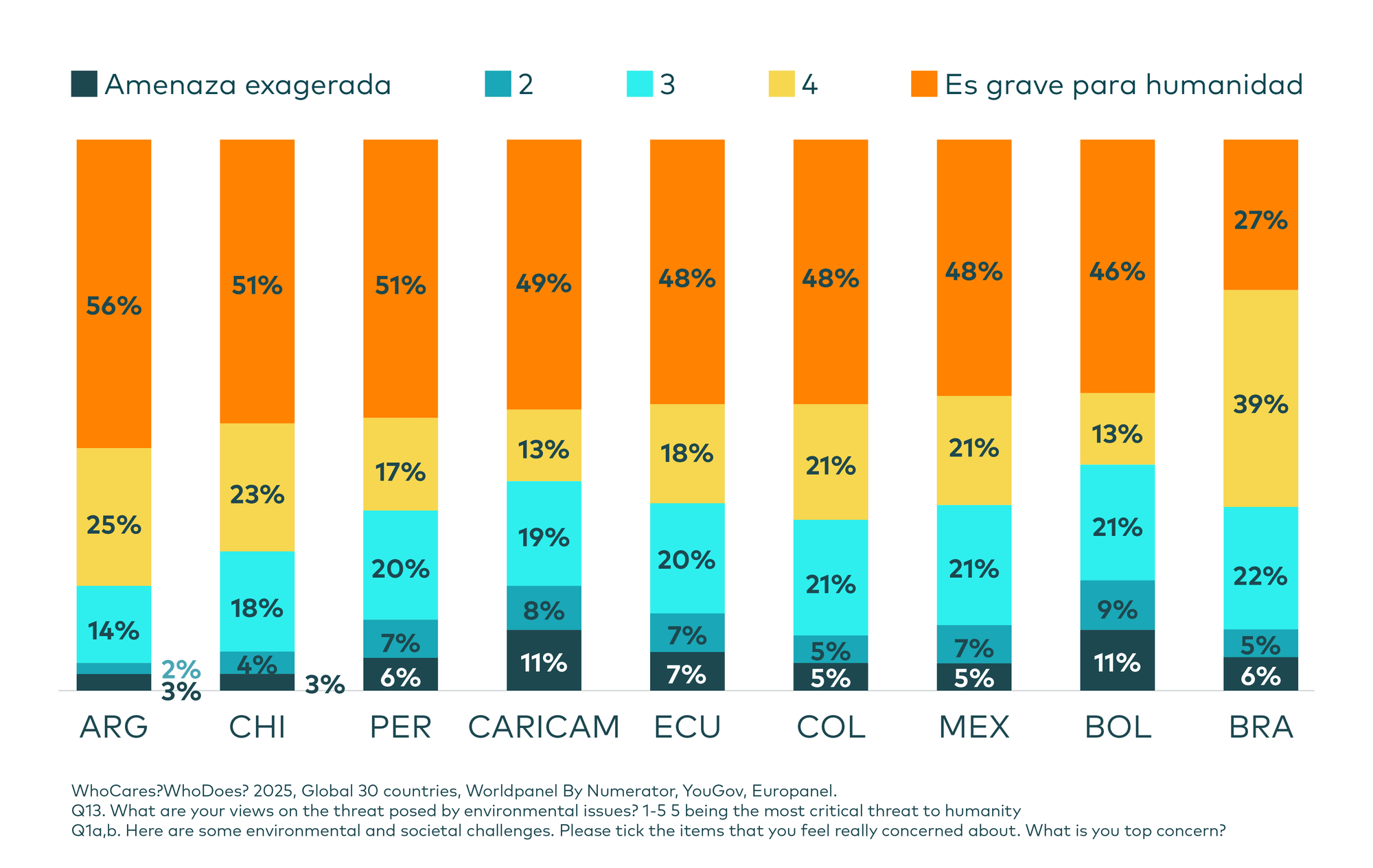 Estas diferencias estructurales también se reflejan en la forma en que las personas perciben la crisis ambiental. Aunque el debate económico y social ha ganado fuerza en los últimos años, el 47% de la población sigue viendo el cambio climático como una gran amenaza para la humanidad, muy por encima del promedio global del 33%. Brasil, así como algunos países de América Central, presenta una pequeña desviación de este patrón: solo el 27% considera el problema extremadamente grave, reflejo, en parte, de los privilegios ambientales del país.