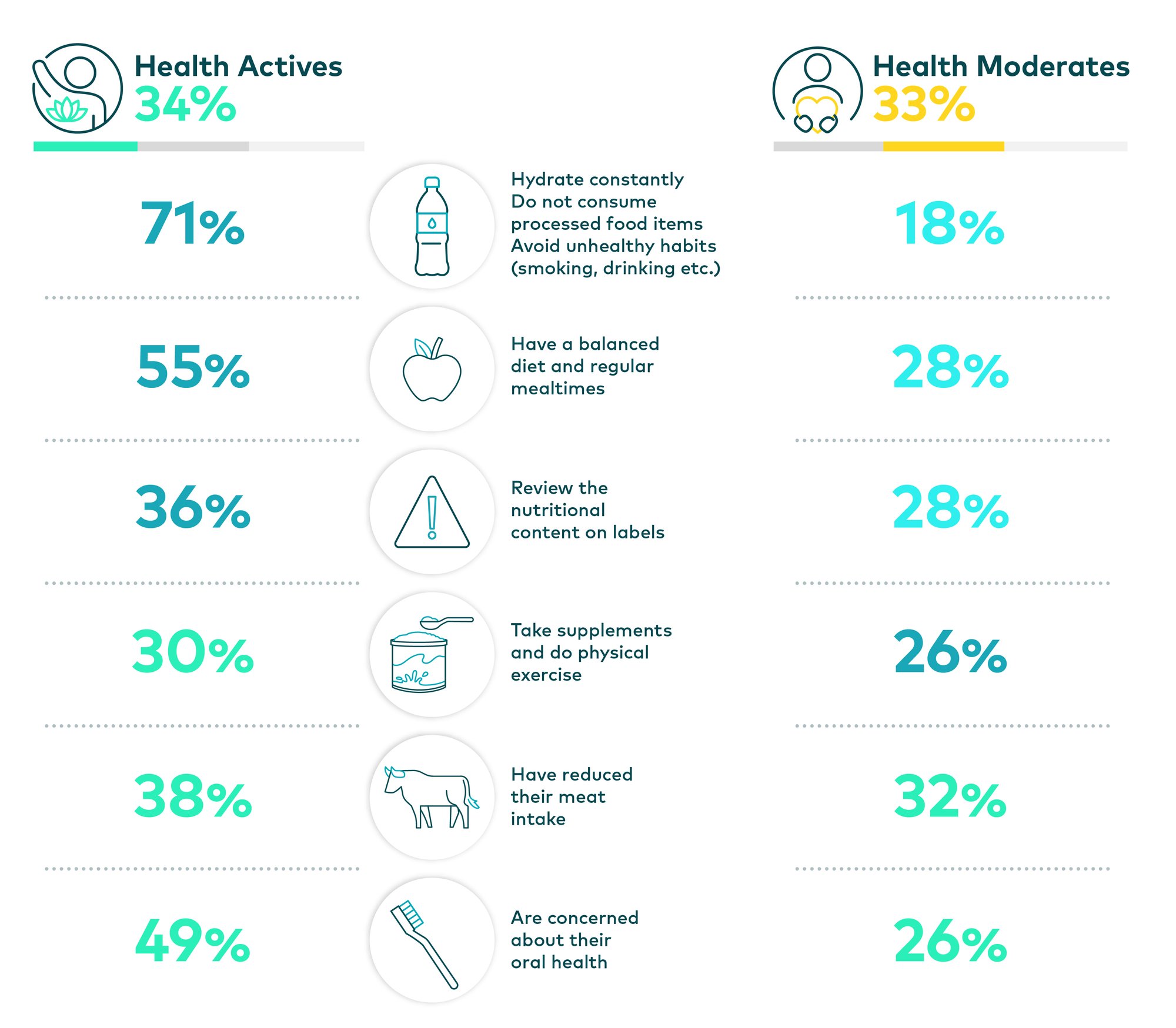 The journey towards a healthier lifestyle can be understood through three distinct groups of consumers. The “Health Actives” are the most engaged, adopting dietary and lifestyle practices to keep their health in check. The “Health Moderates” seek balance, incorporating some healthy habits, but not very consistently. The “Health Passives,” in turn, show little engagement with the topic.