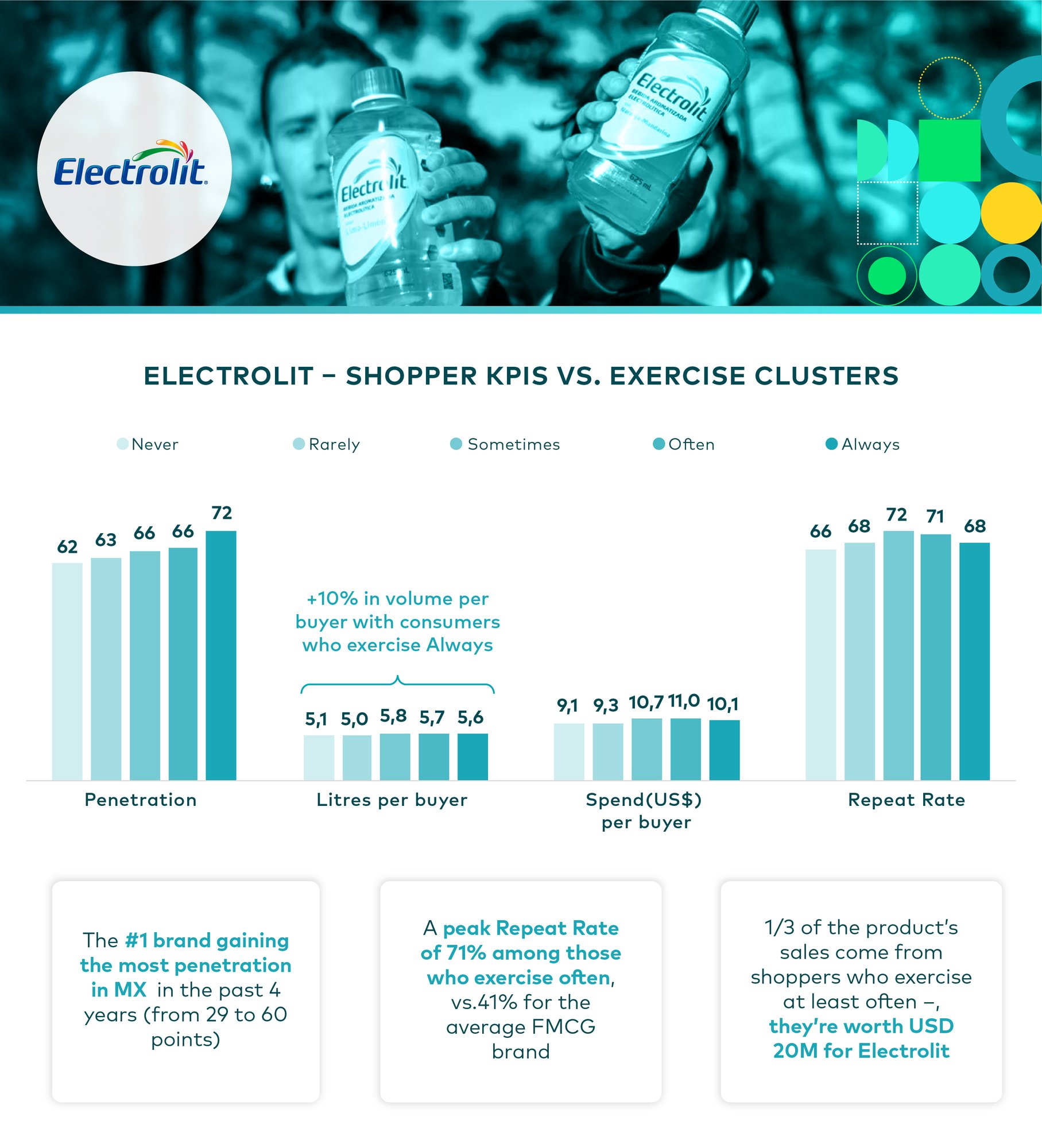 One of the main beneficiaries of this trend is Electrolit, a brand whose penetration has soared from 29% to 60% in just four years. One third of its sales already comes from consumers who exercise frequently, representing around US$ 20 million in value for the company. In addition, the repeat purchase rate reaches 71% among those who exercise regularly.