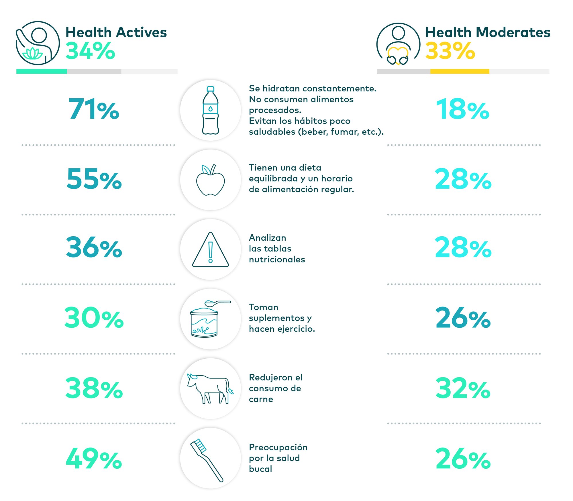Cabe destacar que la diferencia entre los Health Actives y los Health Moderates no radica solo en el compromiso, sino en la coherencia de sus elecciones. Los Actives, por ejemplo, tienden a evitar hábitos considerados perjudiciales, como fumar o beber, y son más disciplinados con la alimentación y la rutina.