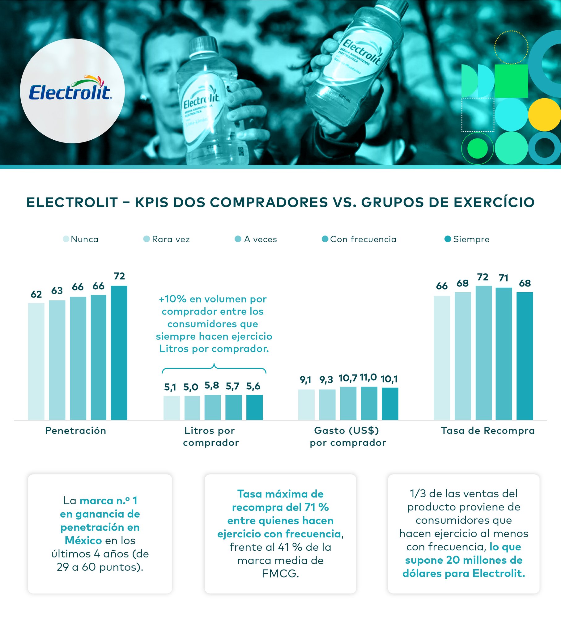 Una de las principales beneficiadas por esta tendencia es Electrolit, una marca que pasó de tener una penetración del 29 % al 60 % en solo cuatro años. Un tercio de las ventas ya proviene de compradores que hacen ejercicio con frecuencia, lo que representa alrededor de 20 millones de US$ en valor para la empresa. Además, la tasa de recompra alcanza el 71 % entre quienes hacen ejercicio con frecuencia.